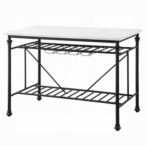 Give off a light and airy feel to a compact cooking space. The Mera Kitchen Island features a artificial stone top paired with a metal slatted shel...