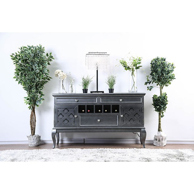 Amina Gray Server, 59 7/8"W X 18 1/2"D X 34 1/4"H, 81.5lbs. This dining collection will be the focal point of any home with its cool gray finish and elegant structure. This stunning server features on its front panels the same Moroccan-inspired inset patterns found on the matching table. Wine storage, drawers , and shelves provide storage for a stylish and functional piece. Features: Transitional Gray Glass, Solid Wood, Wood Veneers, Others Two 5mm Tempered Glass Inserts Cabriole Legs Crystal-Like Acrylic Hardware