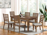 In both casual and formal settings, this beautiful dining table welcomes all guests to a refined experience. Simply designed with transitional flair, the table features plank-style top with squared tapering legs. Full extension drawers on smooth ball-bearing glides found on each side of the table allow for storage of extra dinnerware. A clean and crisp silhouette brings focus to the ladder back chairs and the slightly curved hind legs, along with its contrasting light gray upholstered cushions.